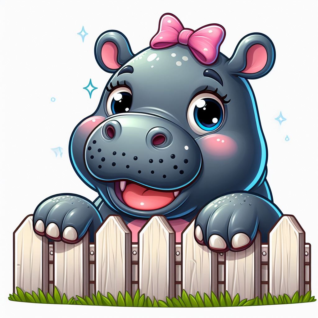 A happy baby hippo with a pink bow peeks over a wooden fence.