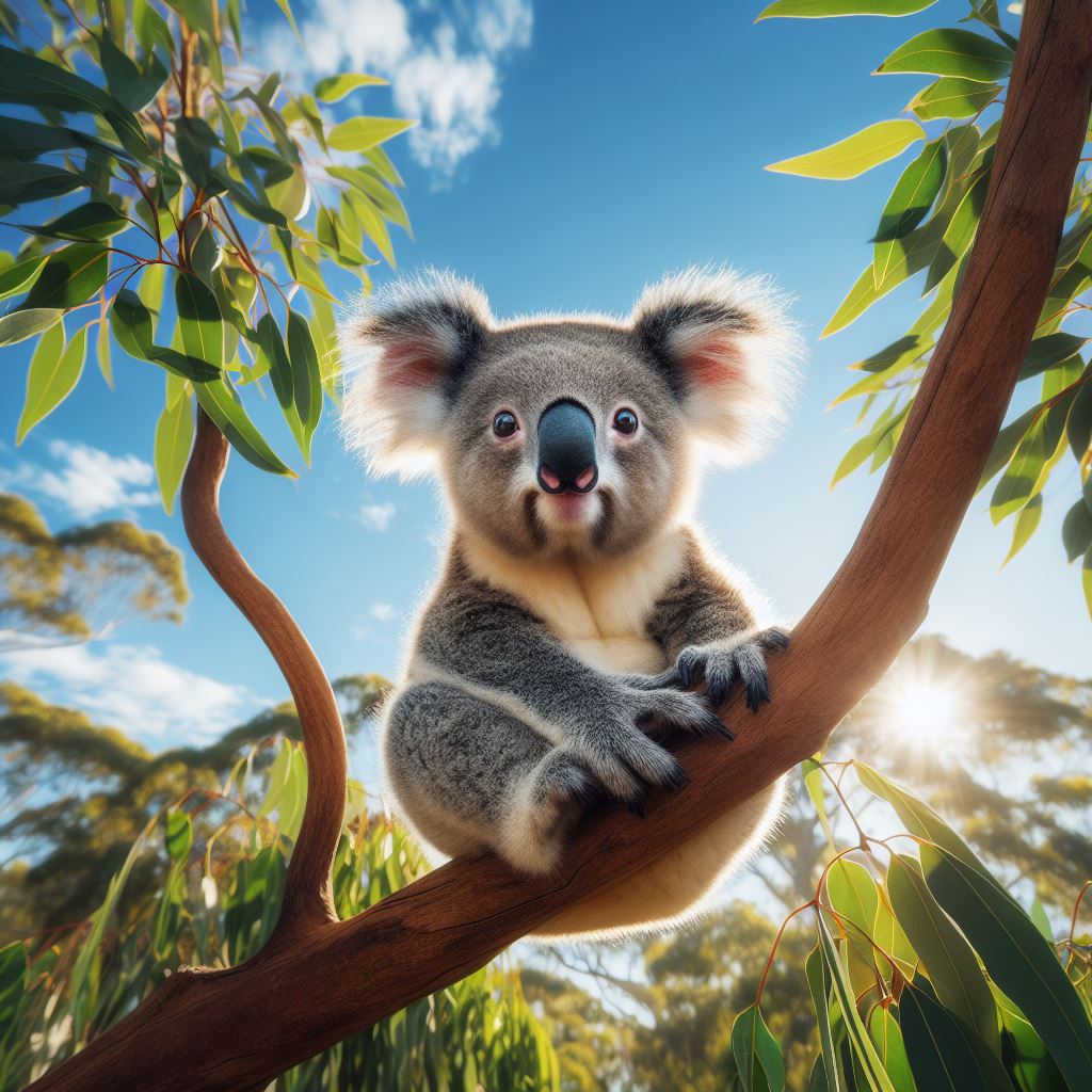 Koala sitting on branch in sunlight