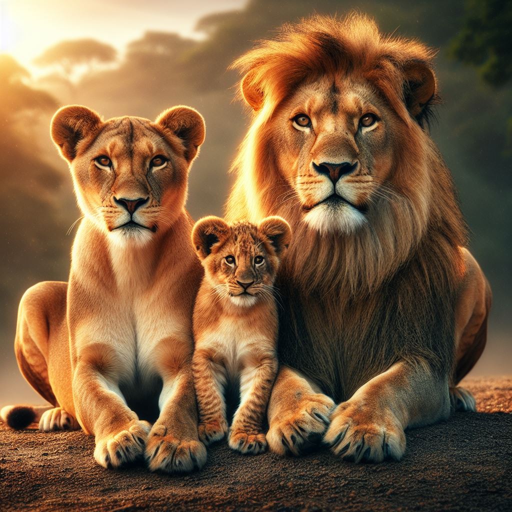A lion, lioness, and cub sit together at sunset in the savanna.