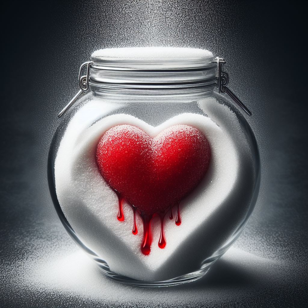 A red heart dripping blood sits in a glass jar filled with white sugar.