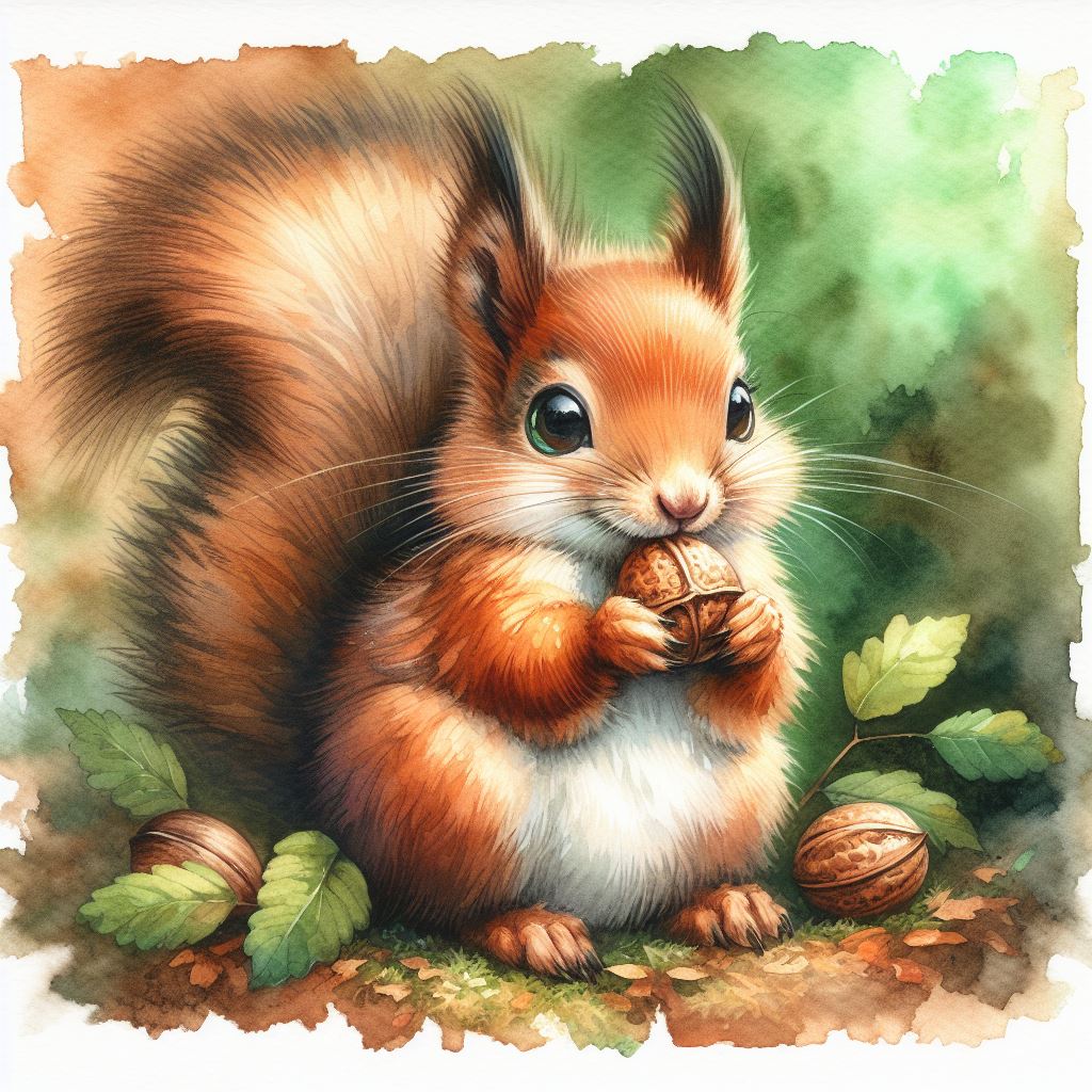A cute, fluffy squirrel sits on the forest floor, enjoying a delicious nut.