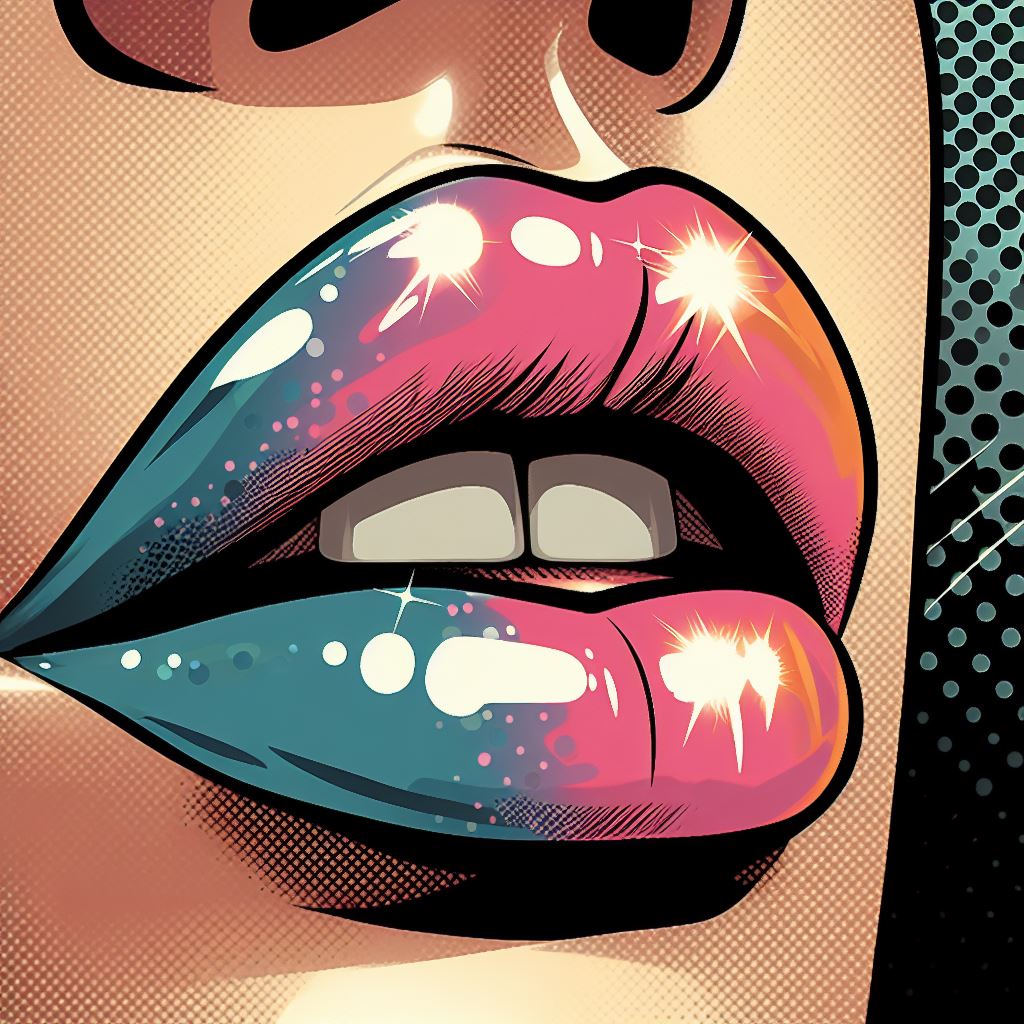 Close-up of a woman's lips with bright pink and blue lipstick, rendered in a pop art style.