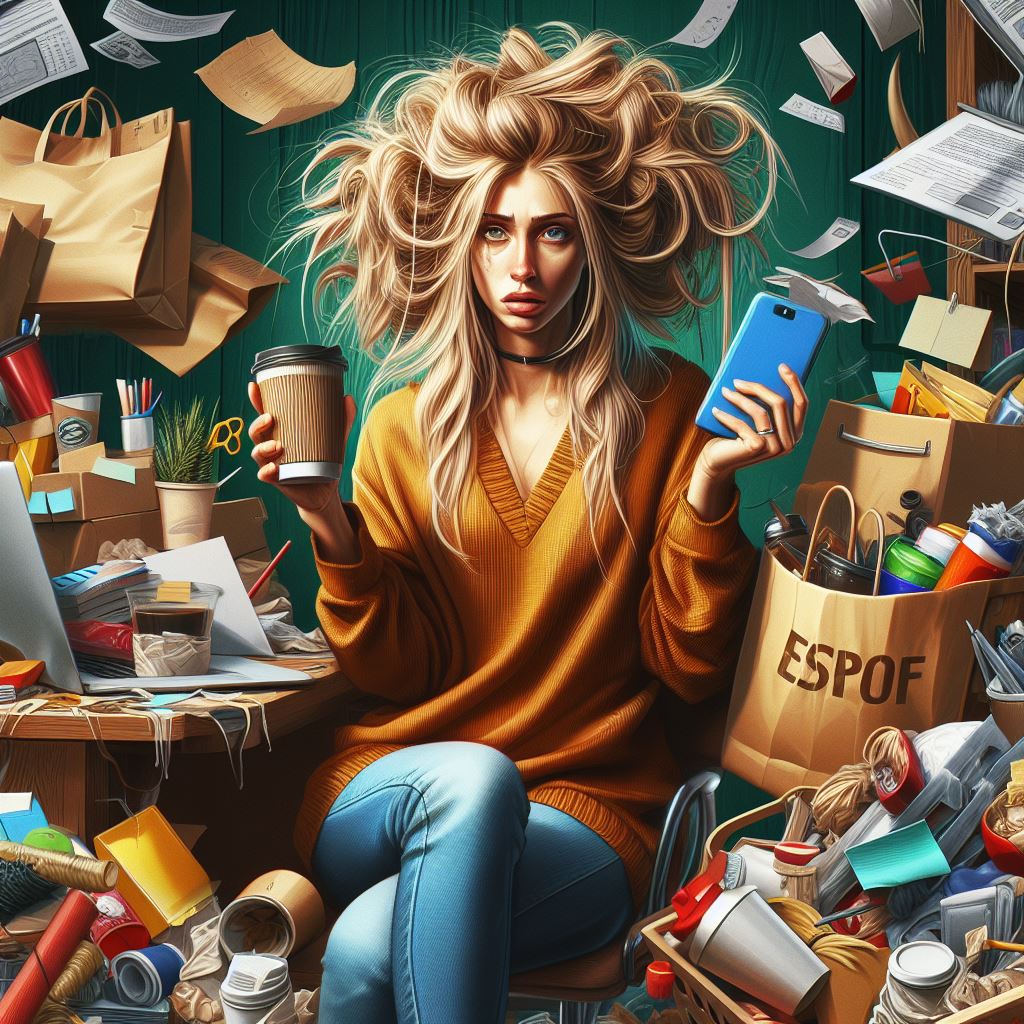 bags, chaos, cluttered, coffee, desk, digital, frustrated, home, lifestyle, mess, modern, office, overwhelmed, papers, phone, room, stress, technology, woman, work