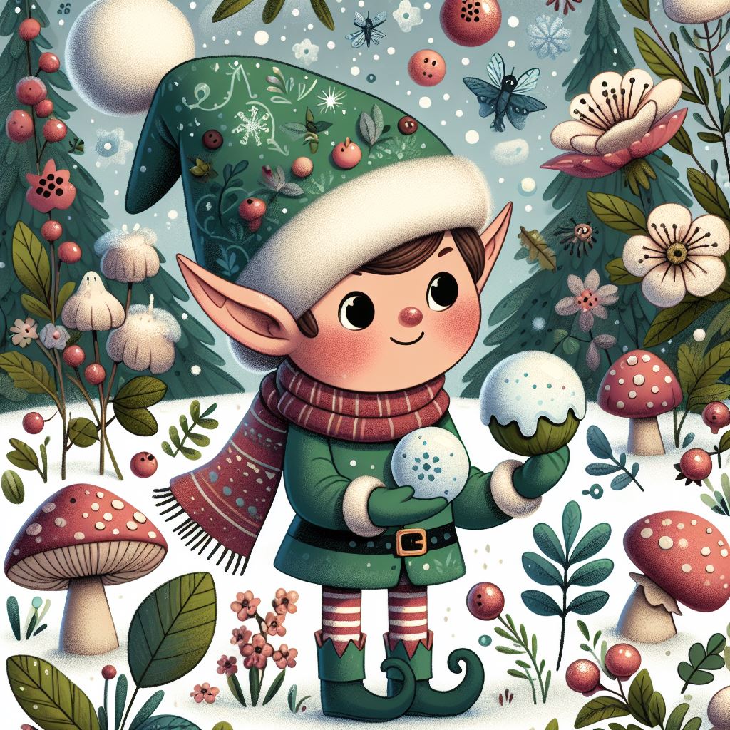 cartoon, cheerful, christmas, cute, elf, festive, forest, green, happy, hat, holiday, illustration, magical, outdoors, scarf, snow, snowball, snowballs, whimsical, winter