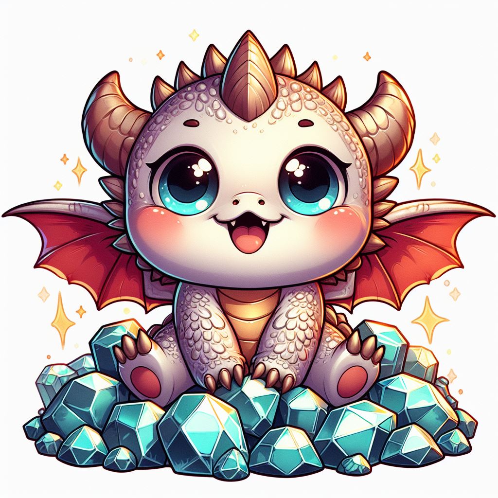 A cartoon dragon with large eyes sits on a pile of blue gems.