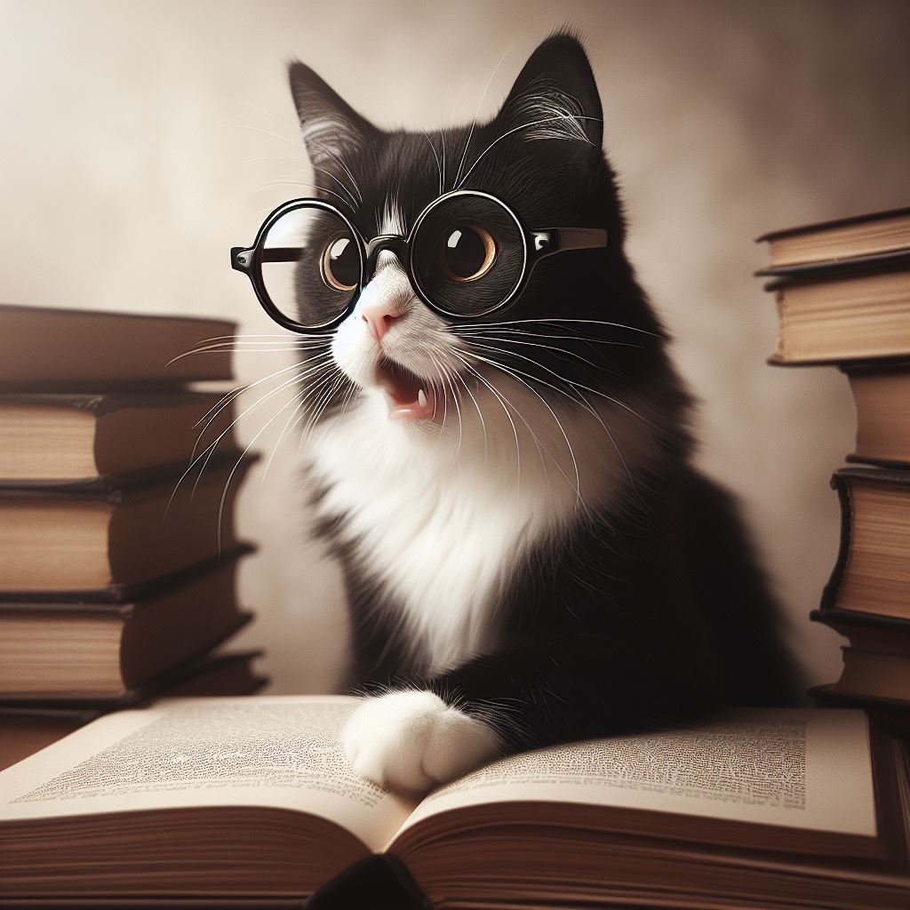 A black and white cat wearing glasses sits on a stack of books, looking up with an open mouth, seemingly surprised by what it's reading.