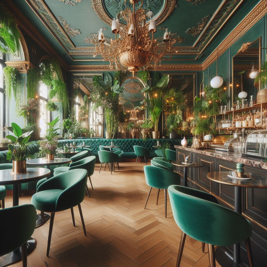 A cafe interior with green velvet chairs and booths, wood floors, and a large chandelier. Plants are visible throughout the cafe.
