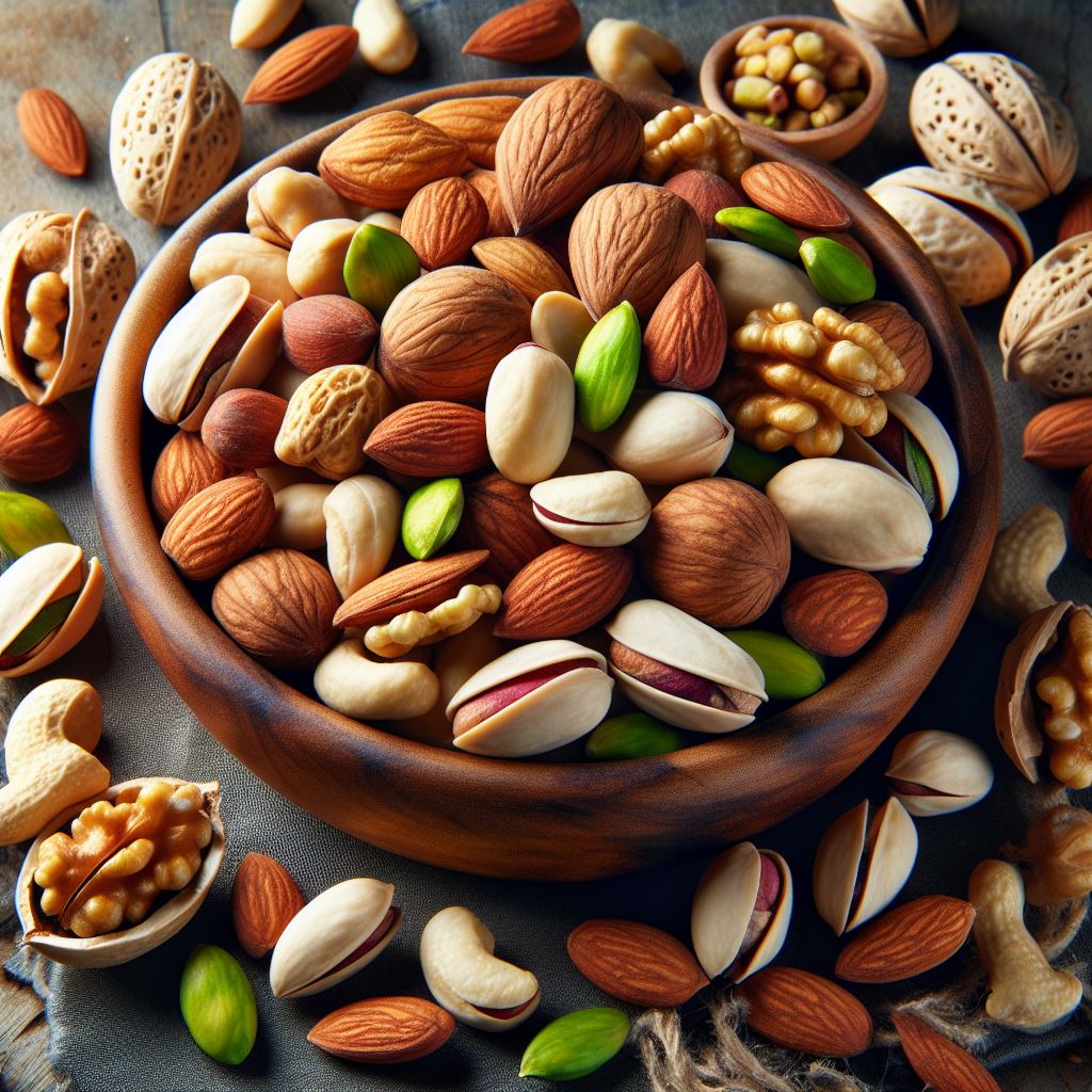A bowl filled with almonds, cashews, pistachios, and walnuts on a rustic table.