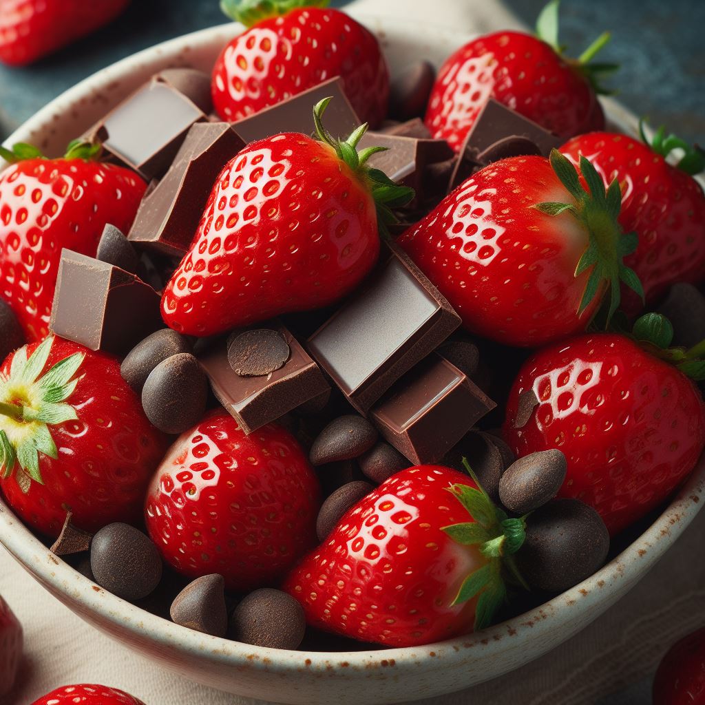 A bowl filled with red strawberries, chocolate squares, and chocolate chips.