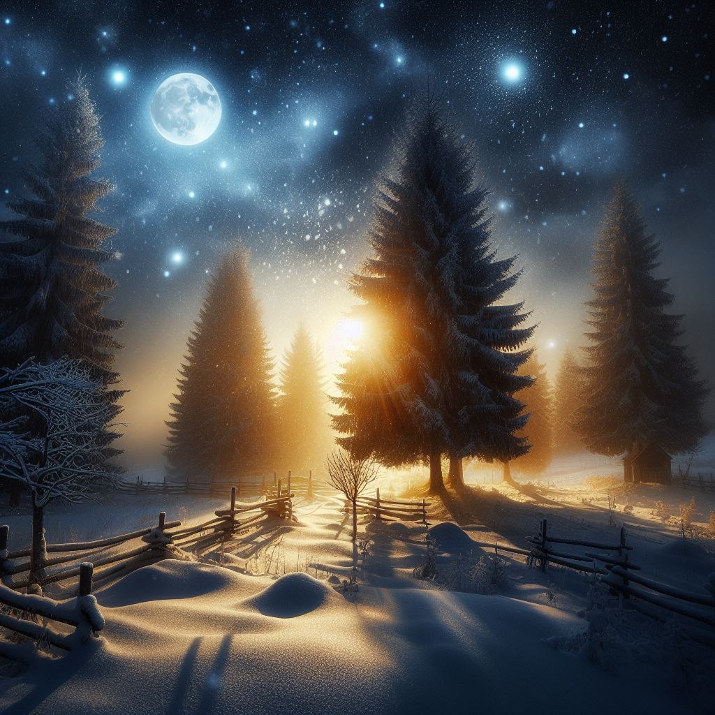 cold, forest, frosted, horizon, landscape, light, moon, moonlight, nature, night, path, scenery, sky, snow, snow-covered, stars, trees, wilderness, winter, wonderland