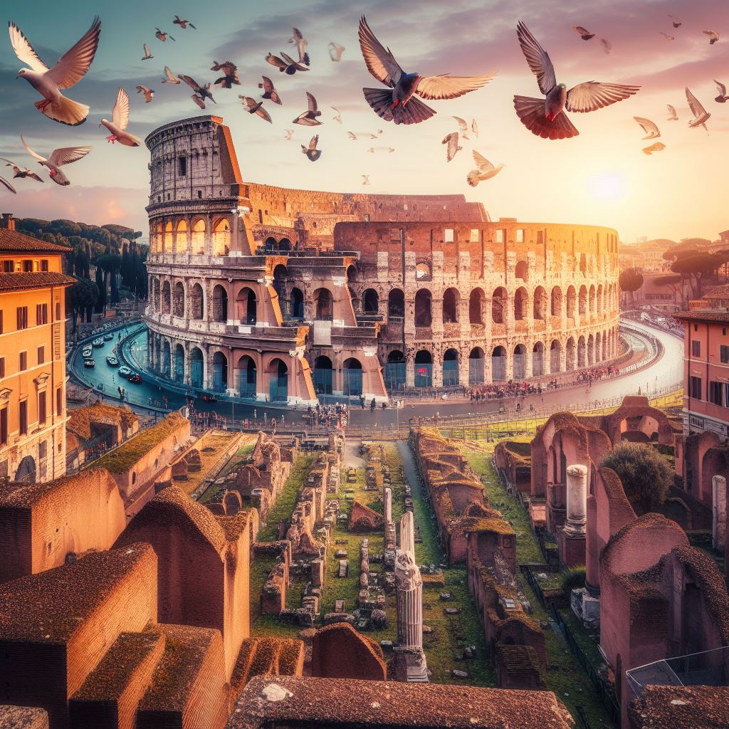 ancient, architecture, cityscape, colosseum, empire, evening, famous, golden, historical, history, hour, italy, landmark, pigeons, roman, rome, ruins, sunset, tourism, travel