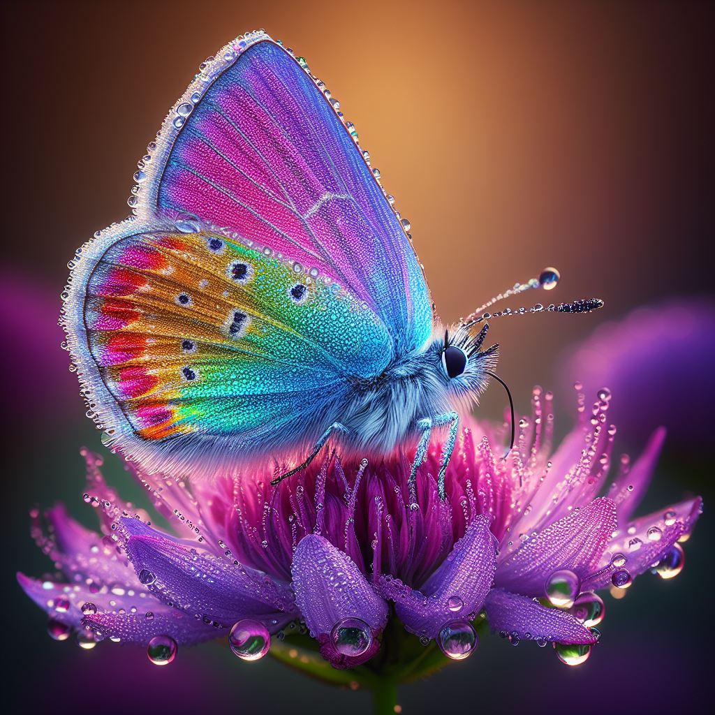 A vibrant butterfly with iridescent wings rests on a purple flower covered in morning dew.