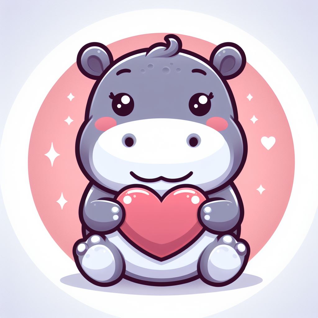 A cartoon hippopotamus sits with a big smile and holds a red heart in its hands.