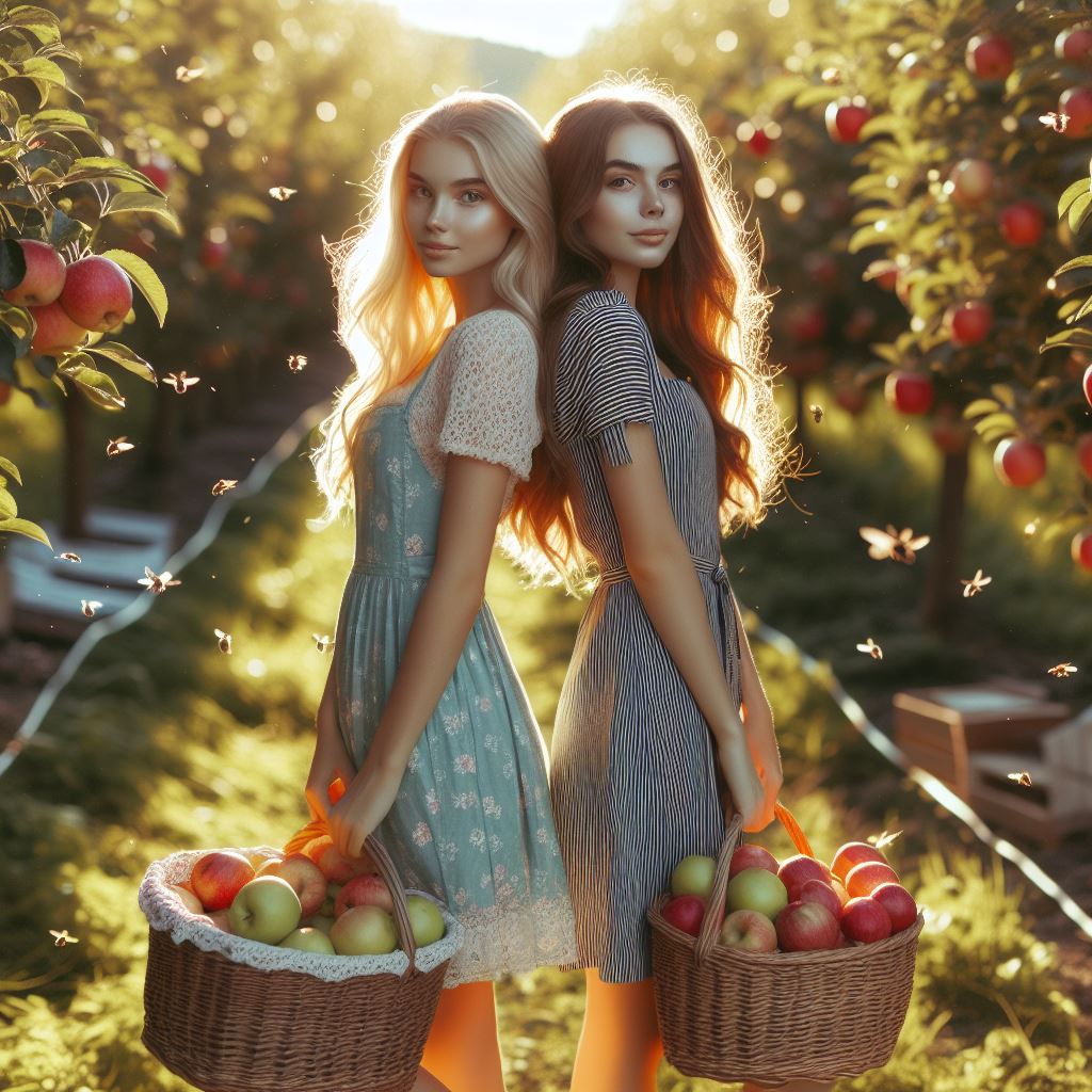 Two women in dresses stand back-to-back in an orchard, each holding a basket of apples, surrounded by golden light.