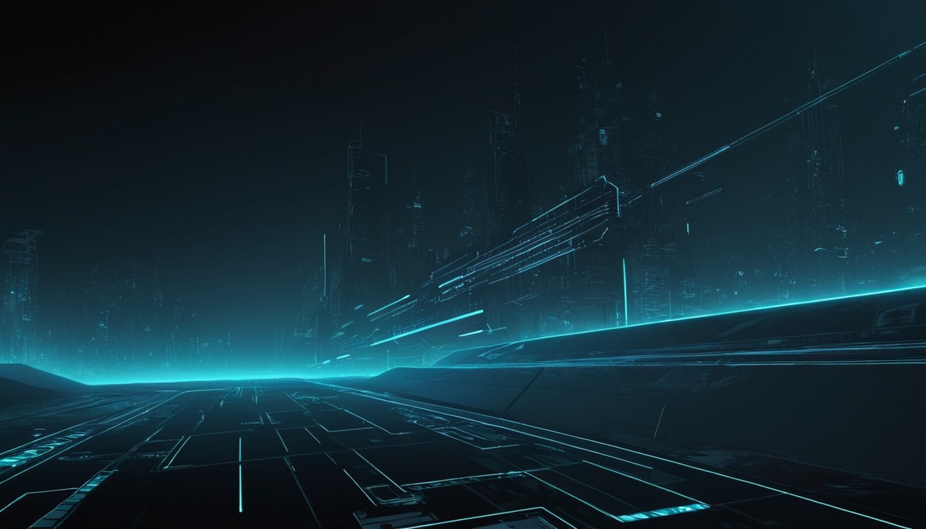 A futuristic cityscape with glowing lines, creating a sense of depth and movement.