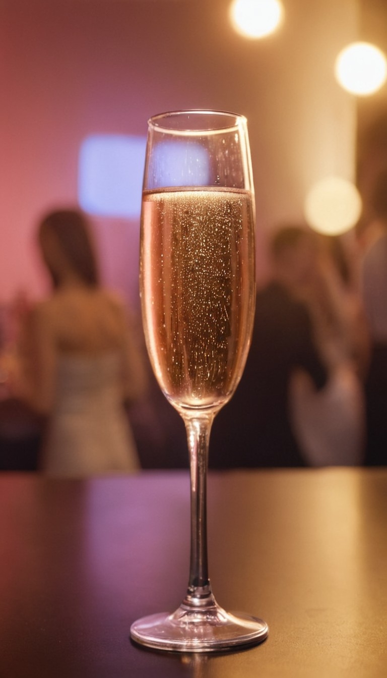 A champagne glass sits on a table at a party, with blurred figures in the background.