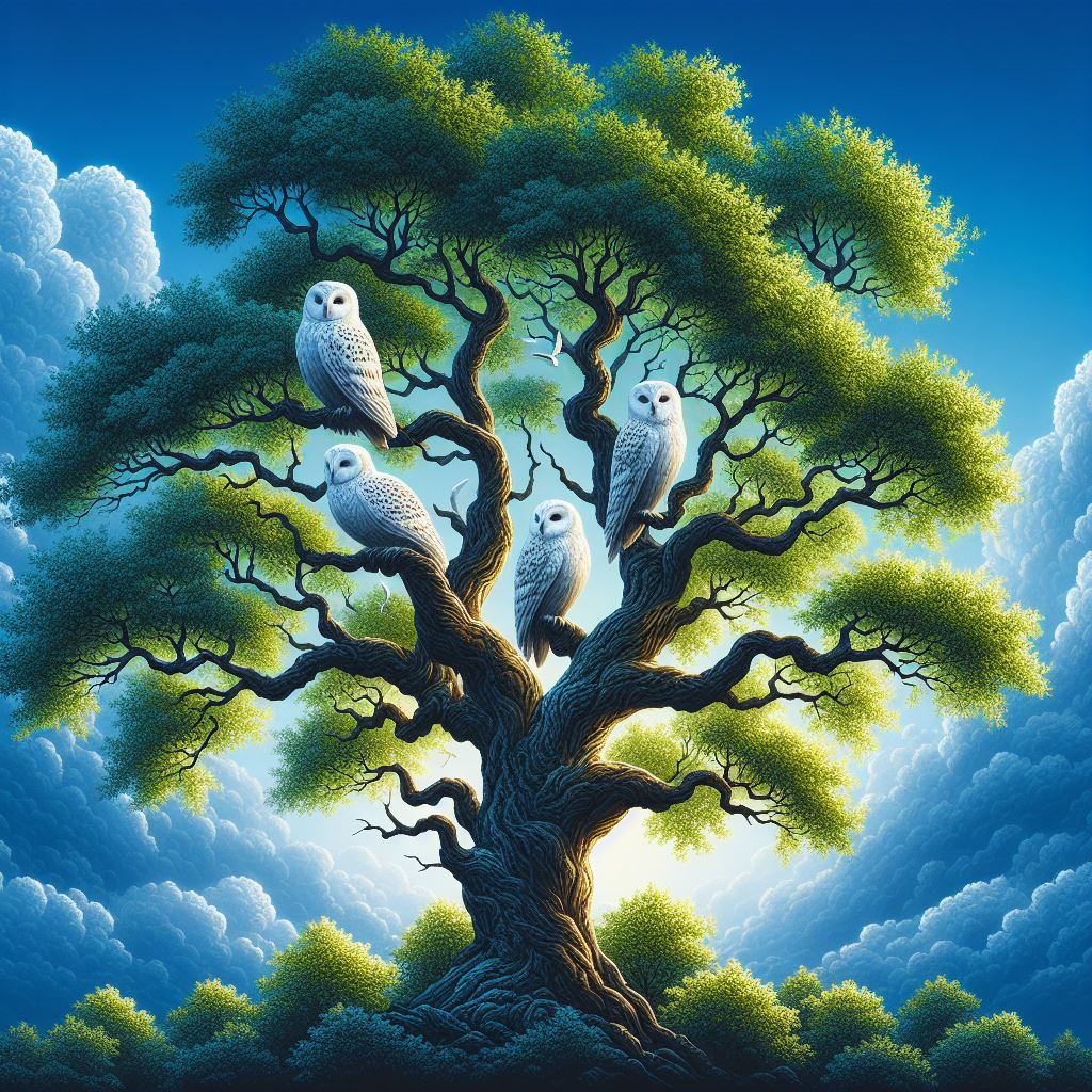 Four white owls perched on branches of a large green tree, with a cloudy blue sky.
