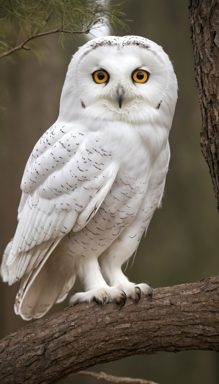 A snowy owl with bright yellow eyes sits on a branch, looking directly at the camera.