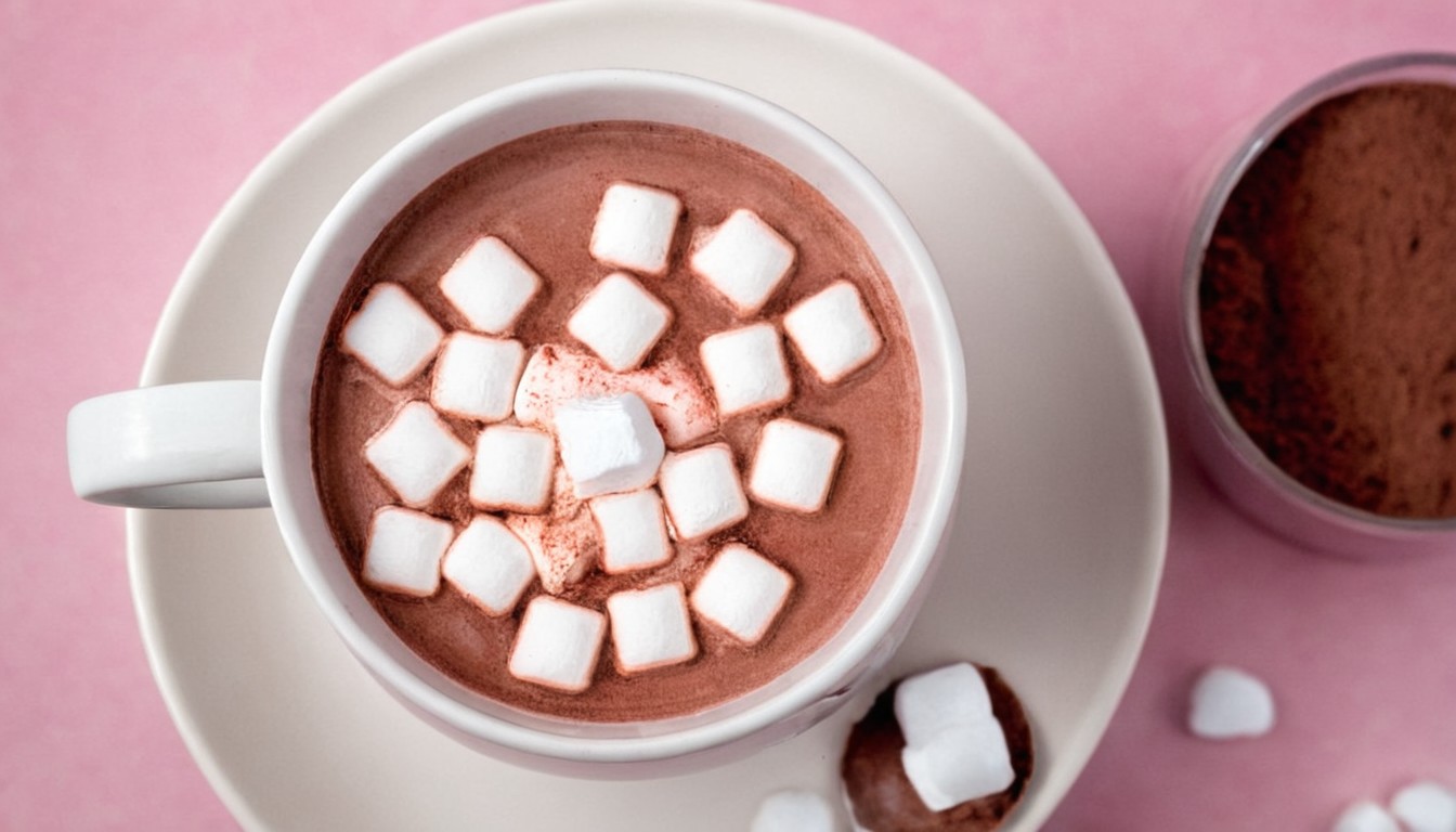 background, beverage, chocolate, cocoa, comfort, cozy, cup, dessert, drink, food, hot, marshmallows, mug, pink, saucer, sweet, treat, warm, white, winter