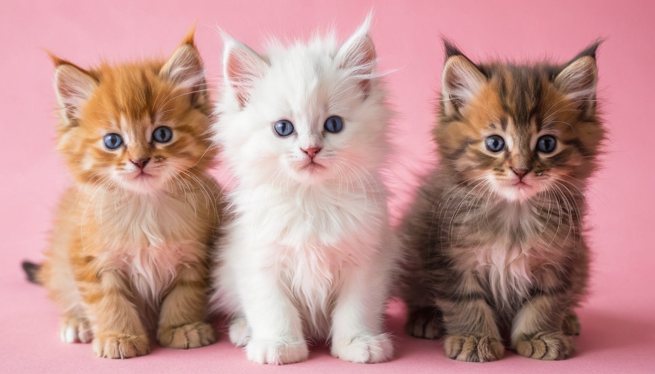 Three fluffy kittens sit side by side on a pink background.