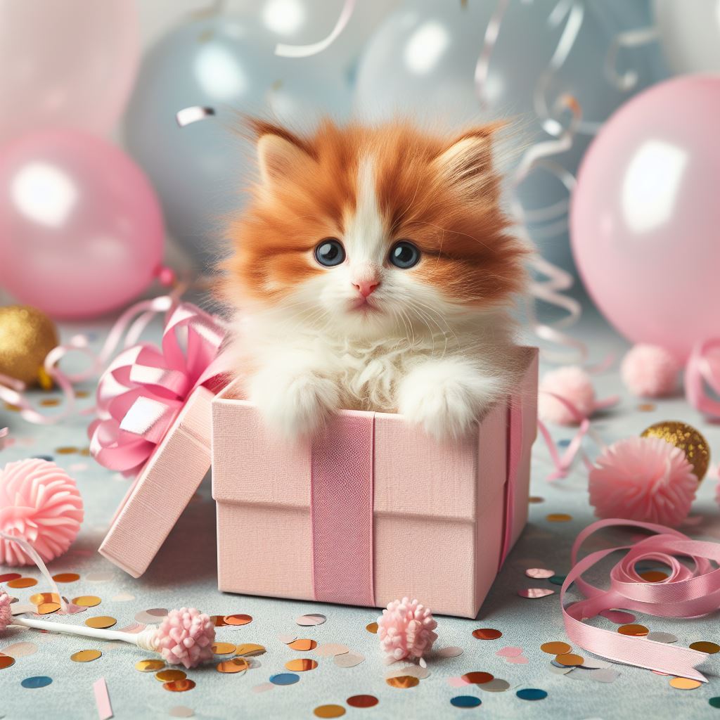 A fluffy kitten sits inside a pink gift box surrounded by balloons and confetti.
