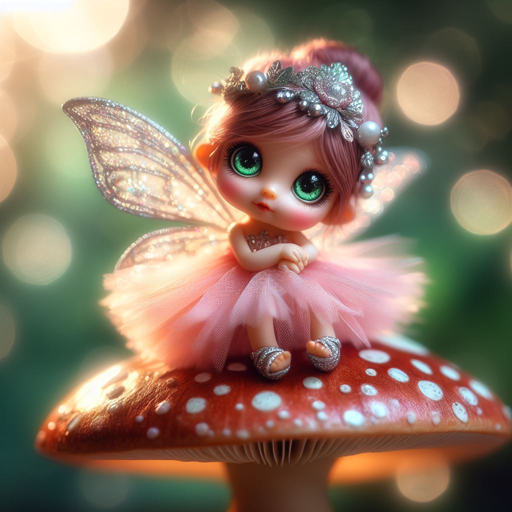 A small fairy doll with pink hair and green eyes sits on a red mushroom with white spots. The doll wears a pink tutu and glittery wings.