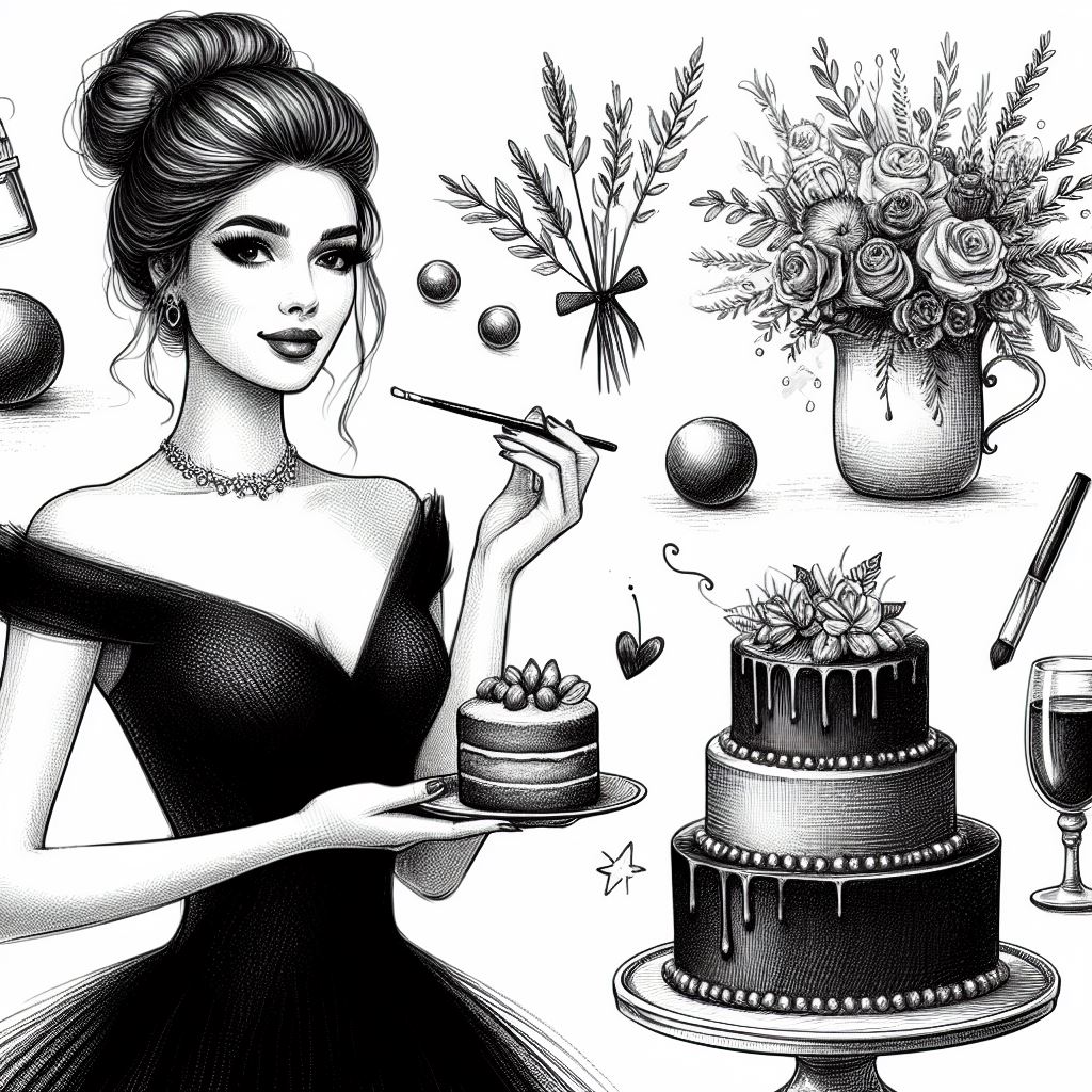 art, black, bouquet, cake, design, dessert, drawing, dress, elegant, flowers, food, illustration, pencil, romantic, sketch, sweet, vase, vintage, white, woman