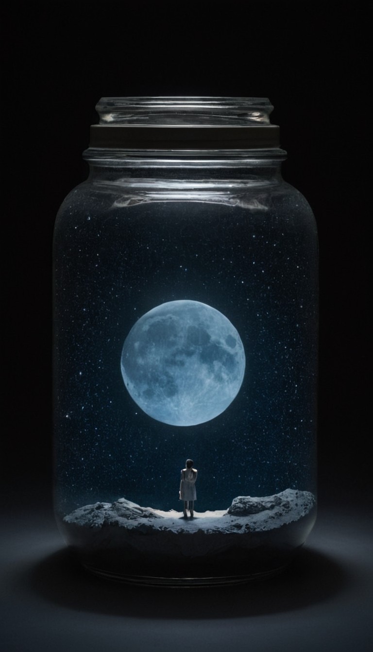 A woman stands on a small moon-like surface in a glass jar, looking up at a large, full moon in a dark, starry night sky.