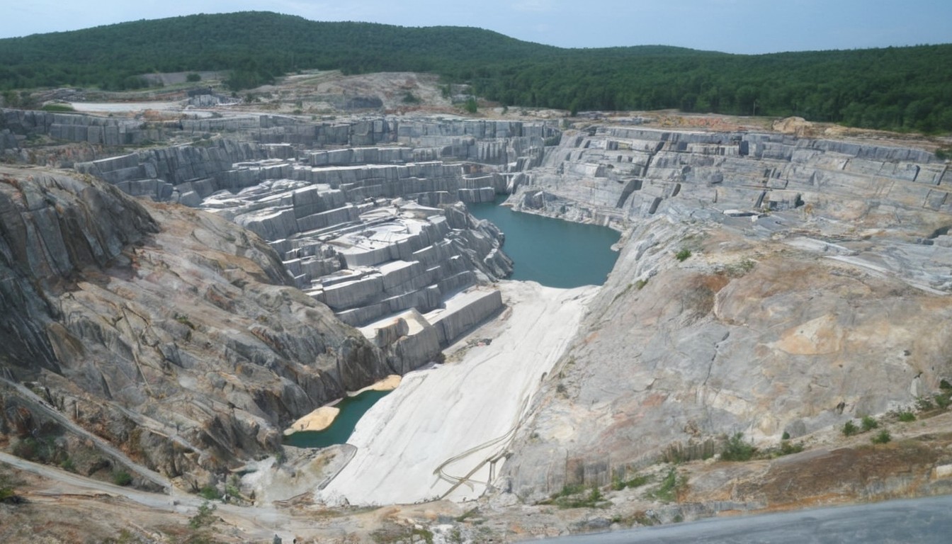 A large quarry with layered rock formations and a man-made lake. The quarry is surrounded by forested hills.