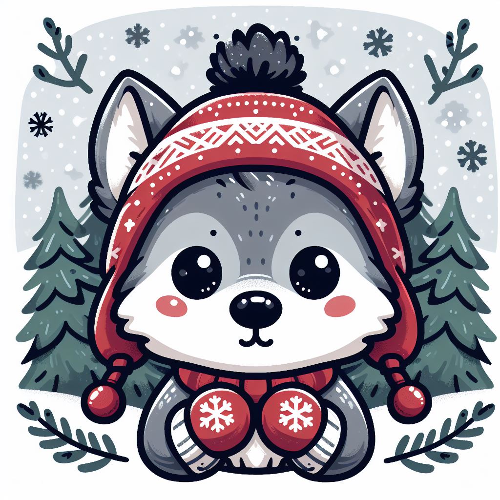 A cartoon wolf in a red hat and mittens stands in a snowy forest.