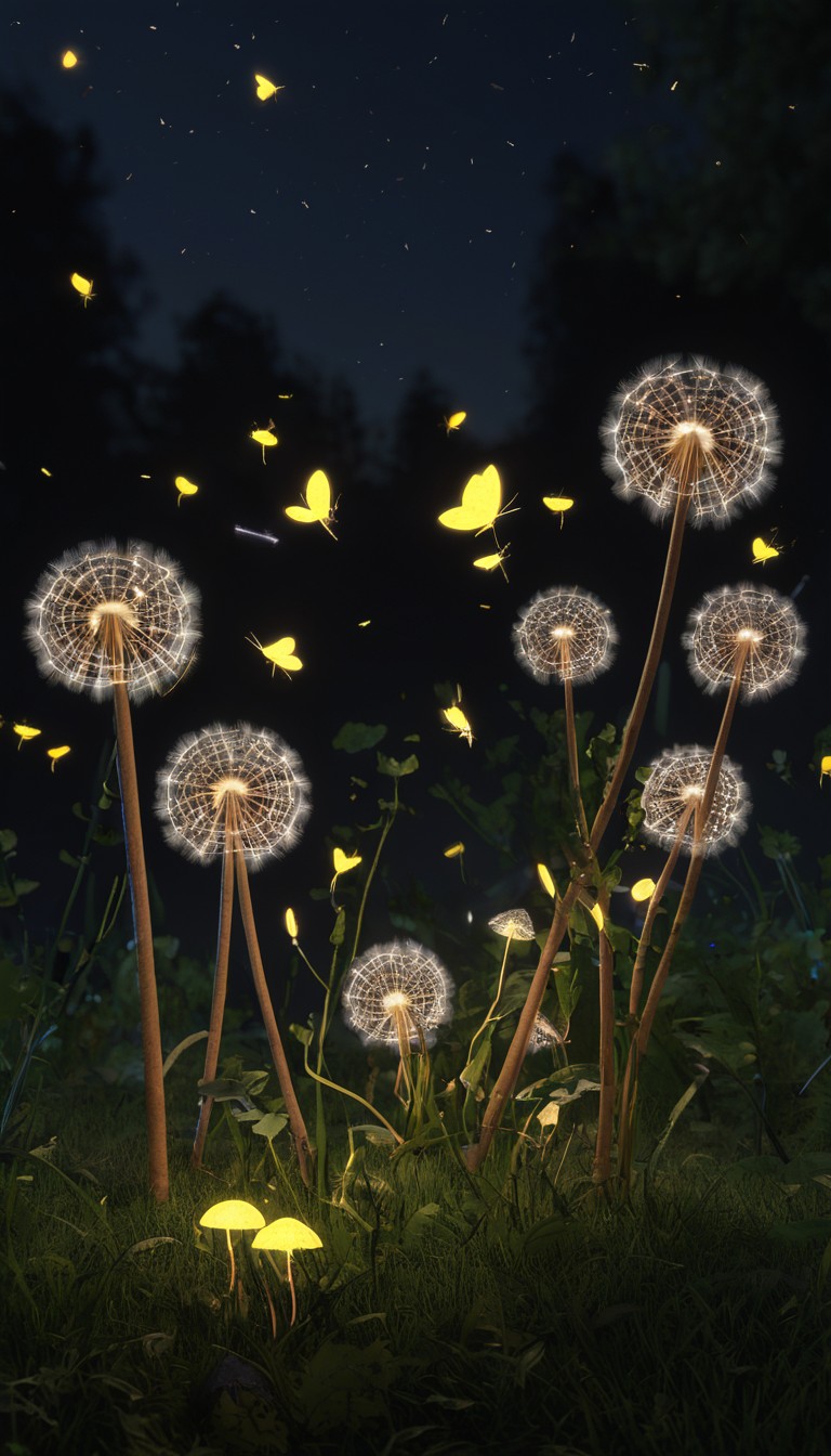 Glowing dandelions and butterflies float in the night sky above a field of green grass.