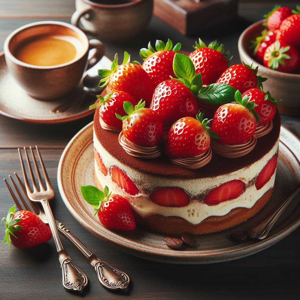 brown, cake, chocolate, coffee, cream, delicious, dessert, food, fork, fresh, pastry, plate, red, strawberry, sweet, table, tasty, tiramisu, treat, wood