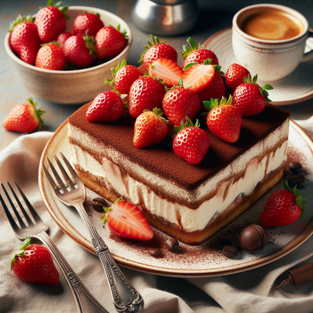 A slice of tiramisu topped with fresh strawberries and a dusting of cocoa powder, served on a plate with a cup of coffee in the background.