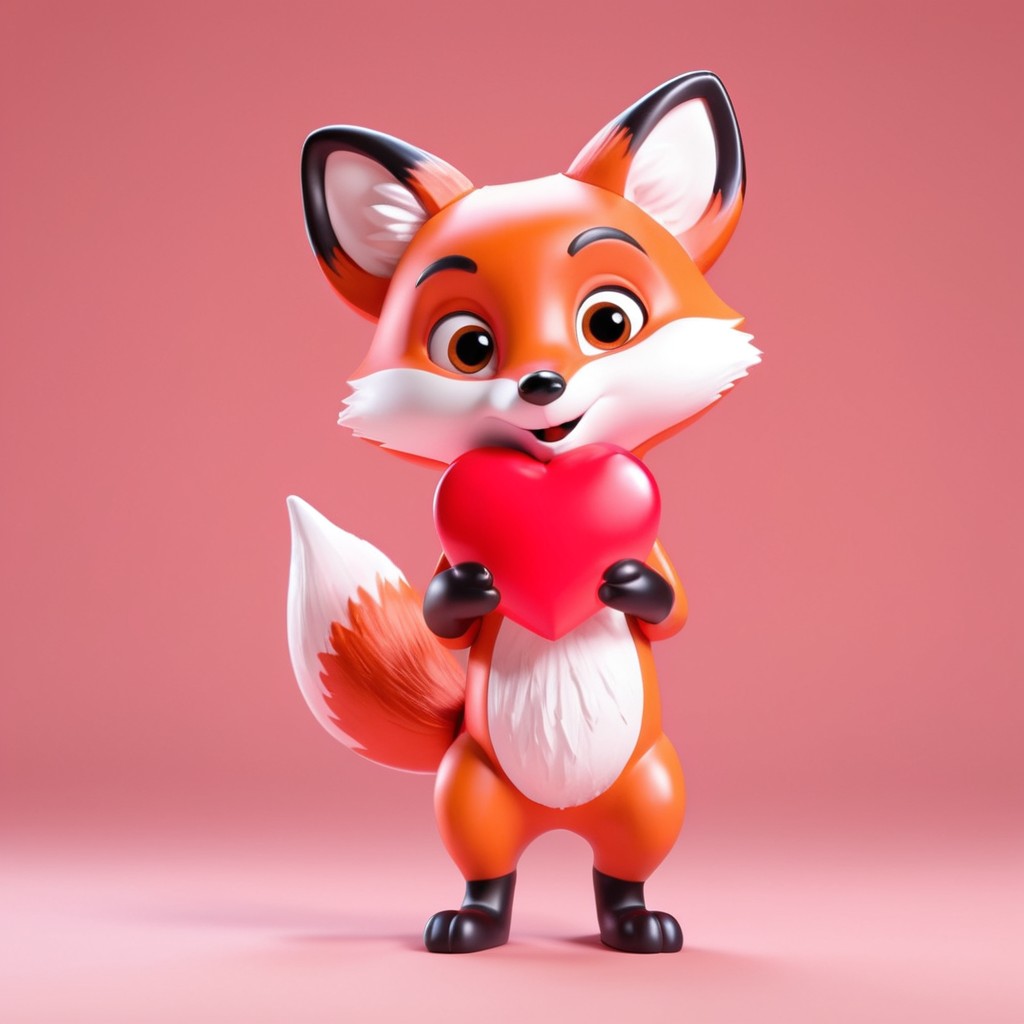 A cartoon fox stands on a pink background, holding a large red heart in its paws.