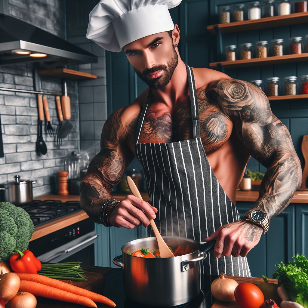 apron, chef, cooking, food, handsome, hat, healthy, kitchen, man, meal, modern, muscles, muscular, pot, stir, stovetop, striped, strong, tattooed, vegetables