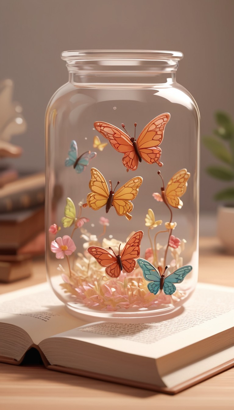 Colorful butterflies in a glass jar on an open book, surrounded by flowers, resting on wood