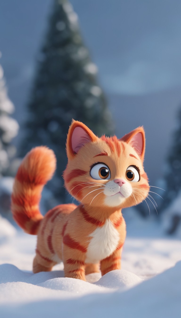 adorable, animal, cat, cute, eyes, feline, forest, furry, kitten, landscape, looking, orange, pet, small, snow, snowy, standing, tabby, trees, winter