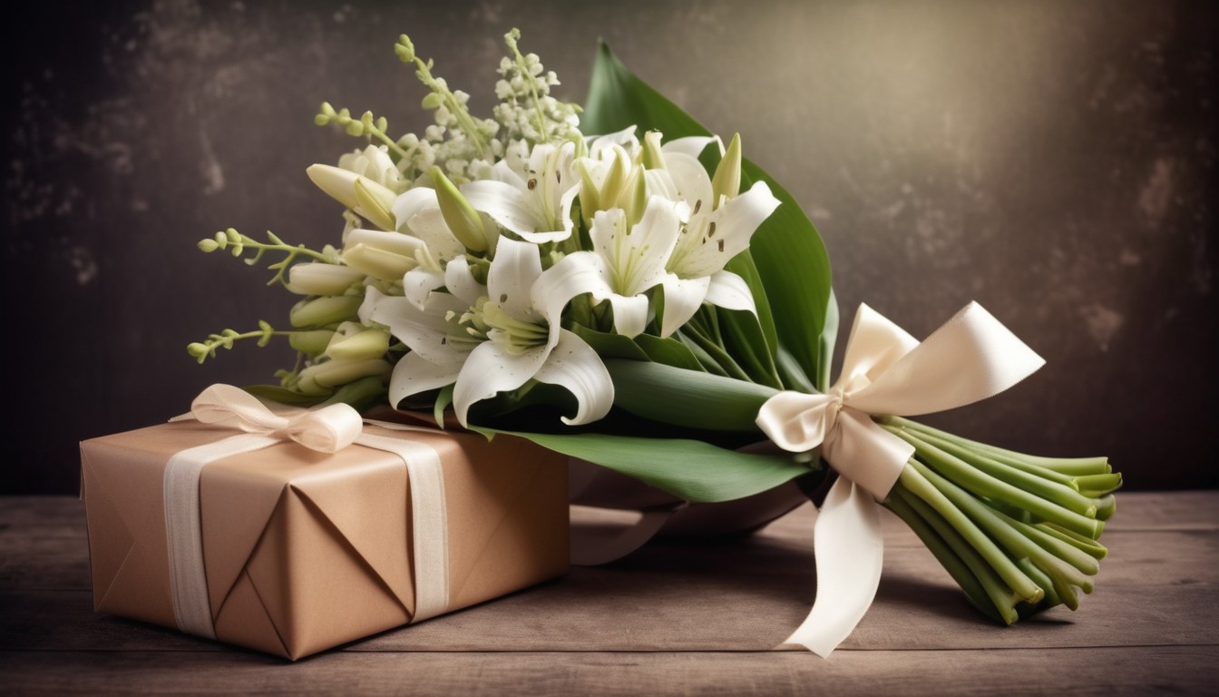 A bouquet of white lilies tied with a white ribbon rests on a wooden table next to a wrapped gift.