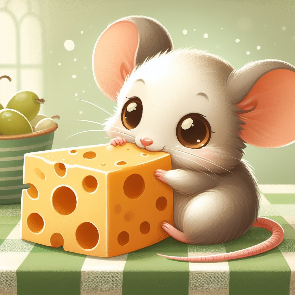 A cartoon mouse with big eyes sits at a table, happily nibbling on a large block of Swiss cheese.