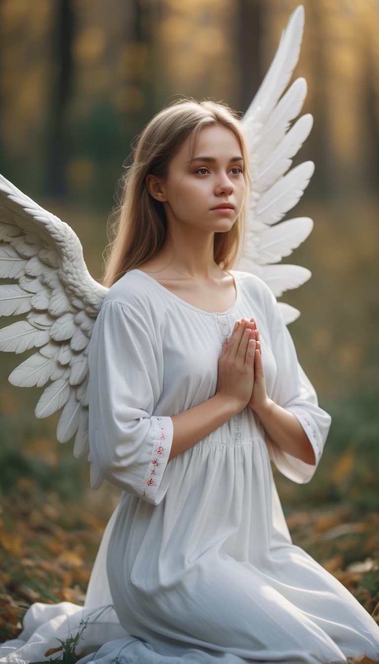 A young woman with angel wings kneels in a forest, her hands clasped in prayer.