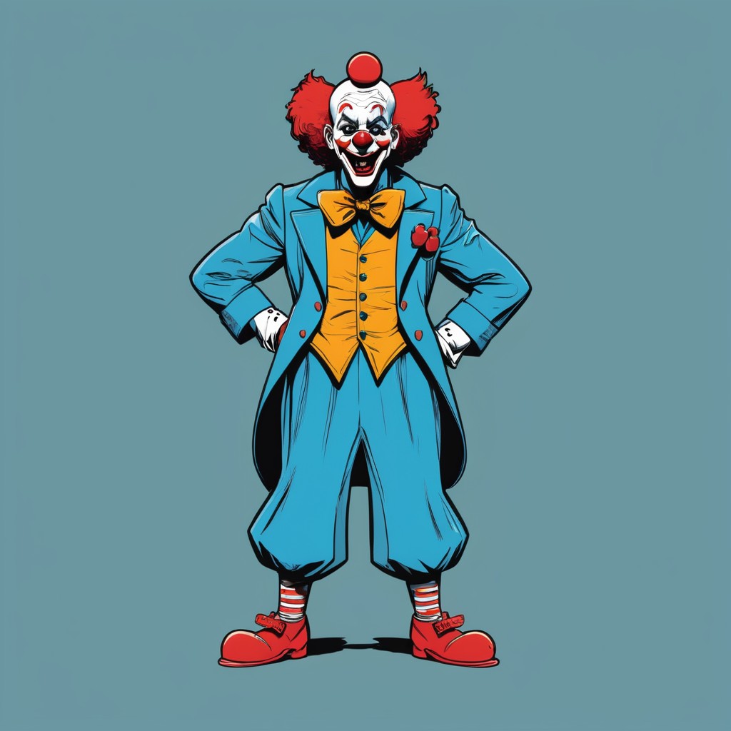 A cartoon clown with red hair and a big smile stands with hands on hips. He wears a blue suit, yellow vest, and red shoes.