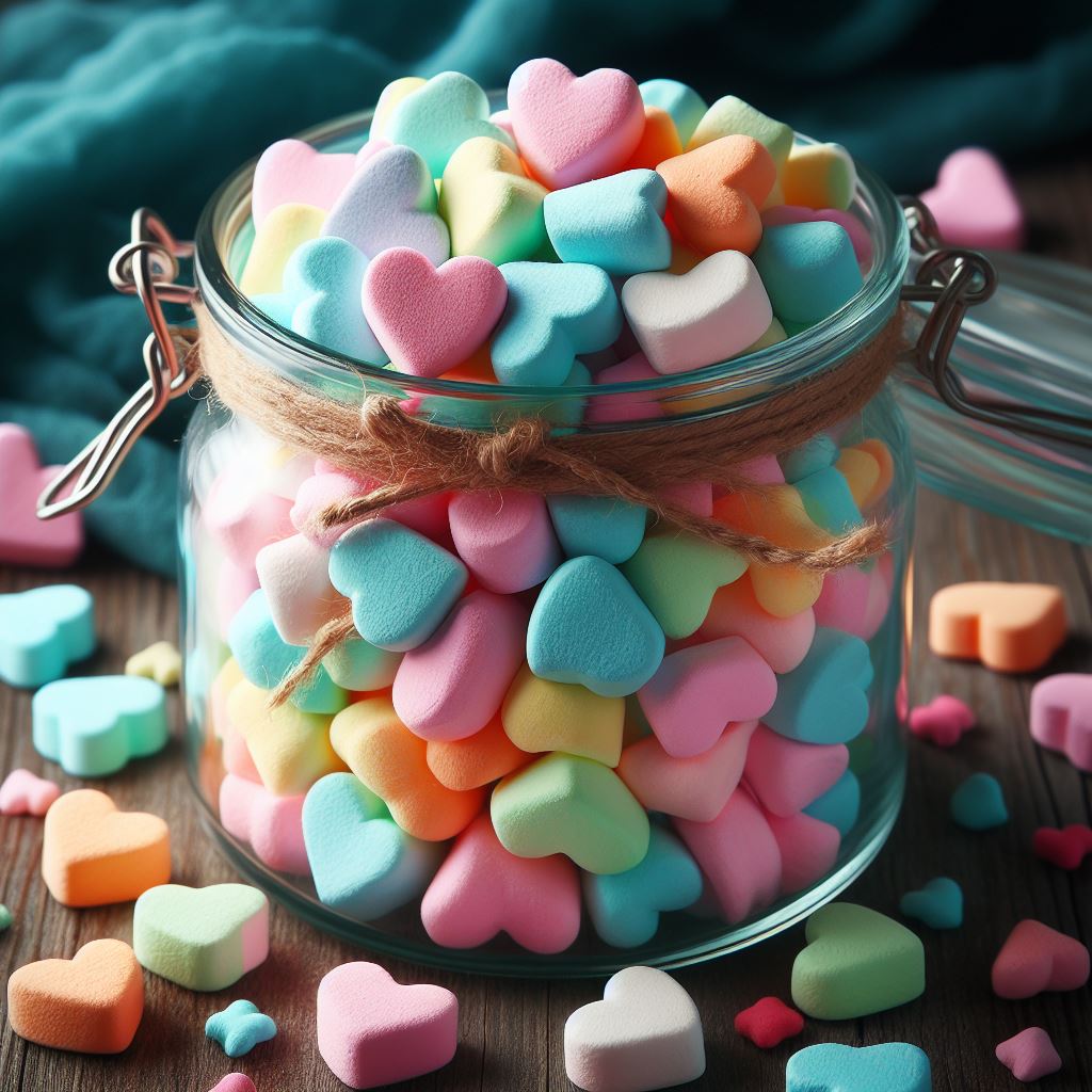 A glass jar filled with colorful heart-shaped candies, with a few spilling out onto a wooden surface.