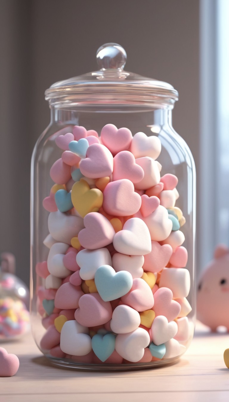 A glass jar filled with colorful heart-shaped marshmallows.