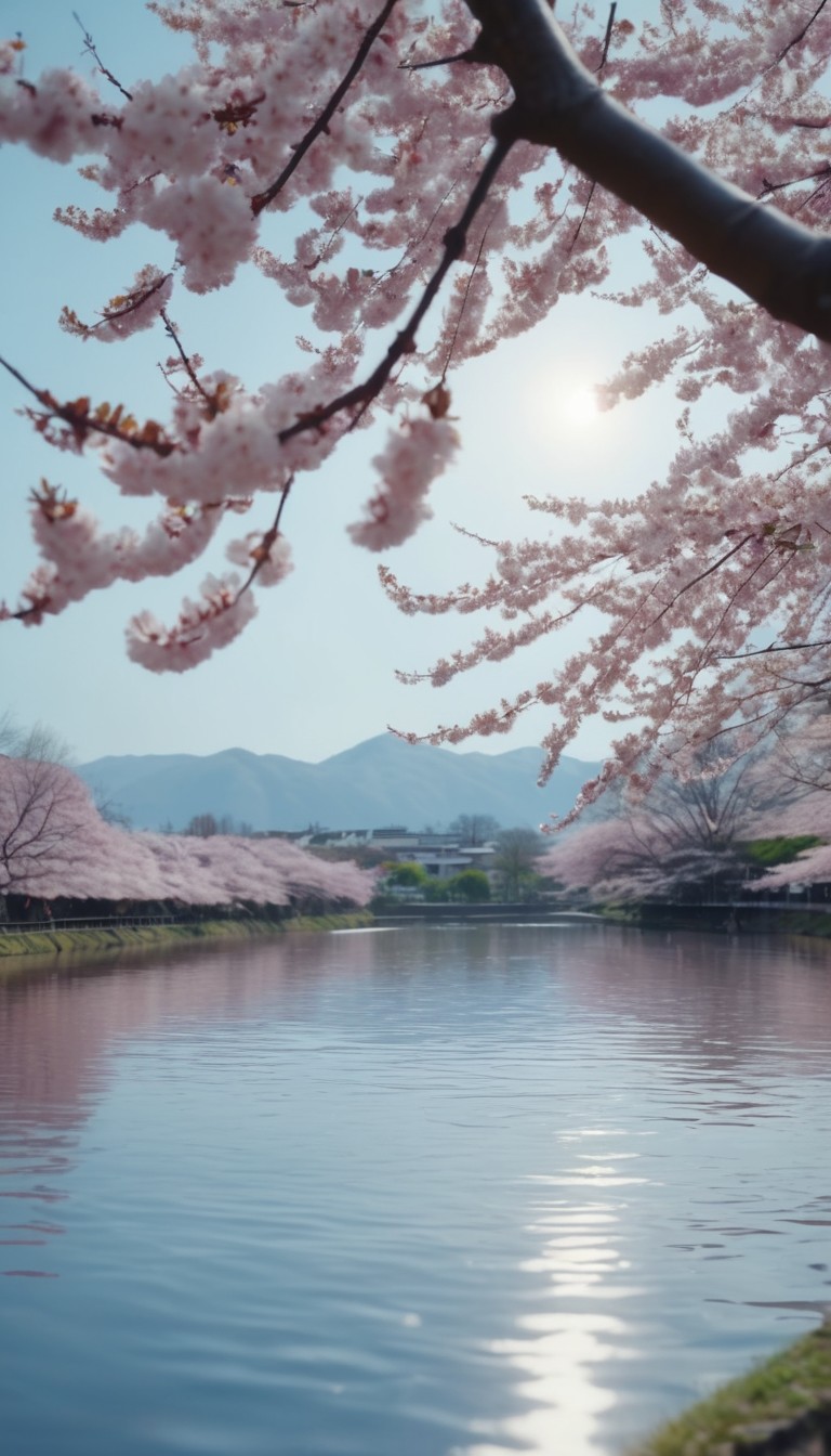 beautiful, blossom, blue, cherry, flowers, japanese, landscape, mountains, nature, peaceful, pink, reflection, river, scenery, sky, spring, sunlight, tranquil, trees, water