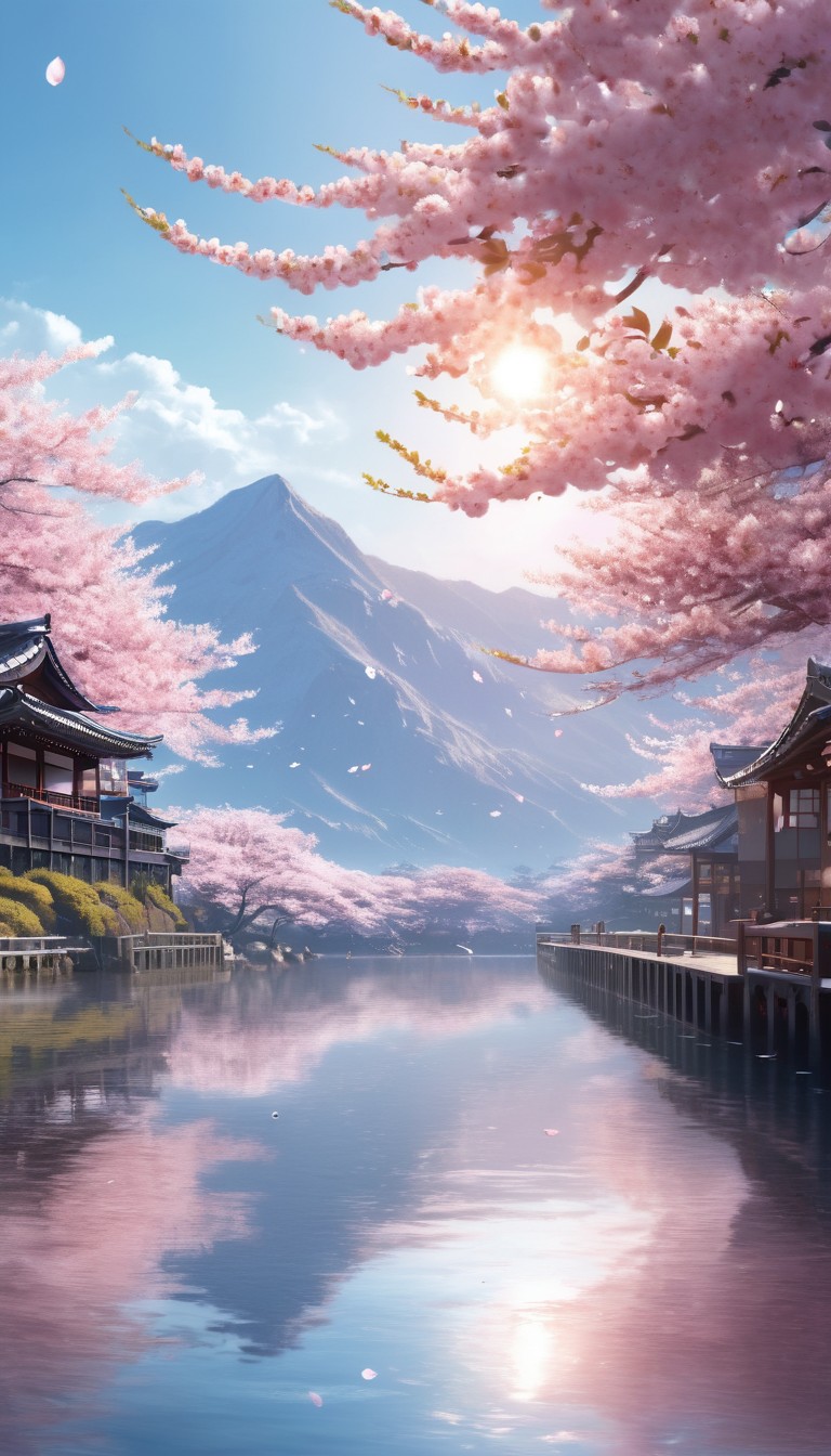 A tranquil Japanese scene with cherry blossoms blooming over a river and a snow-capped mountain in the background.