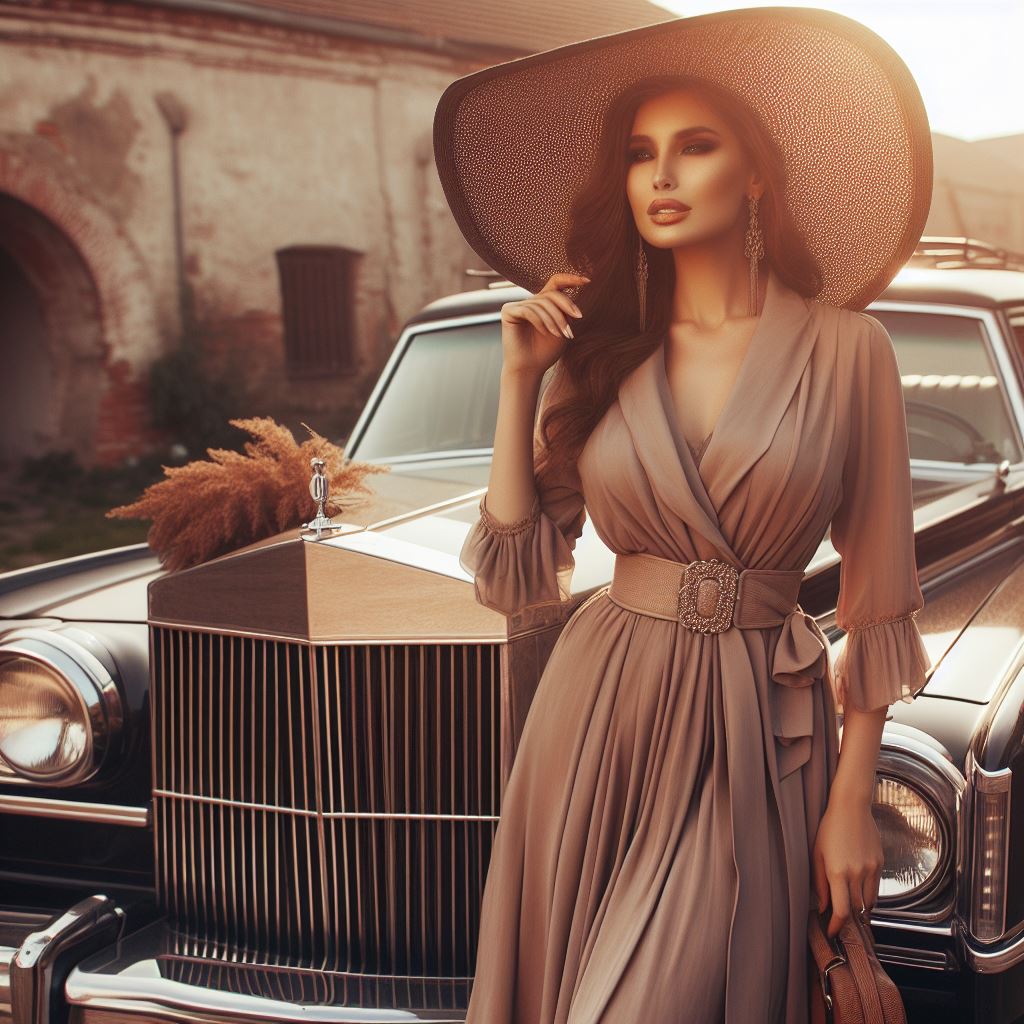 A woman in a wide-brimmed hat and a flowing dress stands beside a vintage car.