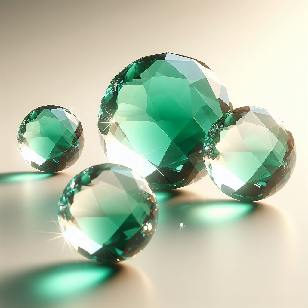 Three green crystal spheres sit on a light-colored surface. The largest sphere is in the center, and the two smaller spheres are on either side.