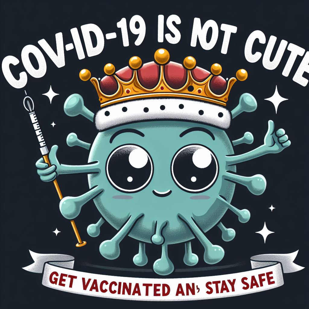 A cartoon depiction of a coronavirus with a crown, holding a syringe, and the phrase Get Vaccinated and Stay Safe.
