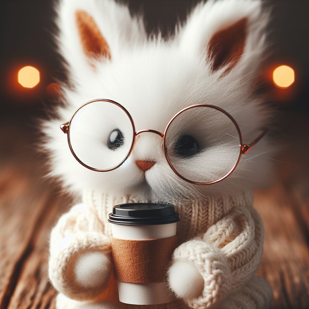 A white bunny wearing round glasses and a white sweater holds a cup of coffee.