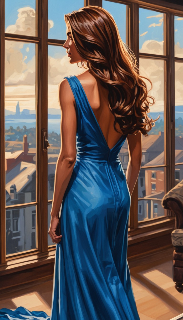A woman in a blue dress stands by a window, looking out at a city skyline.